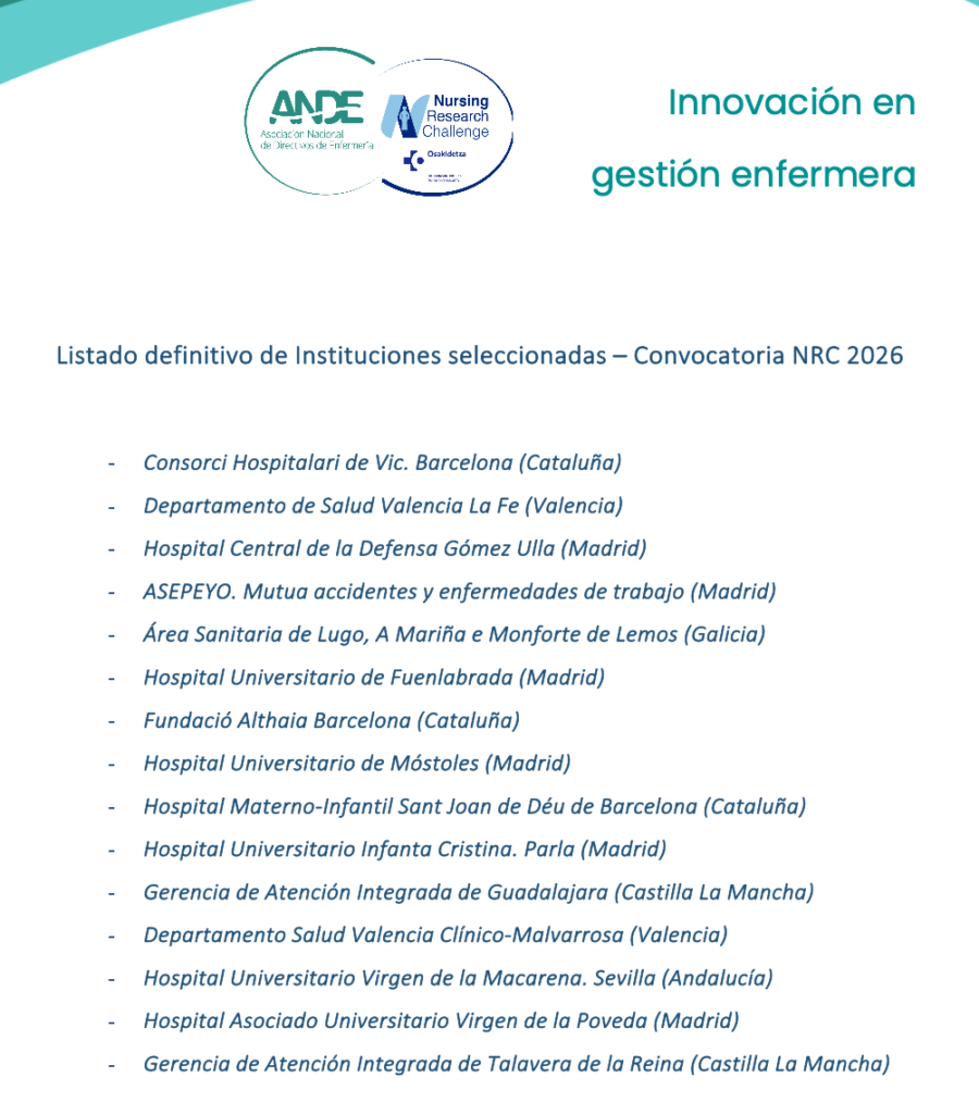 15 centros o instituciones han sido seleccionados para configurar la Convocatoria 2026 del proyecto ANDE-NRC, lo que significa que ya son 45 los centros/instituciones que lo conforman a nivel nacional. Nuestro reconocimiento a direcciones de enfermería y líderes o co-líderes que trabajarán comprometidamente para mejorar la investigación y la innovación enfermeras así como los cuidados […]